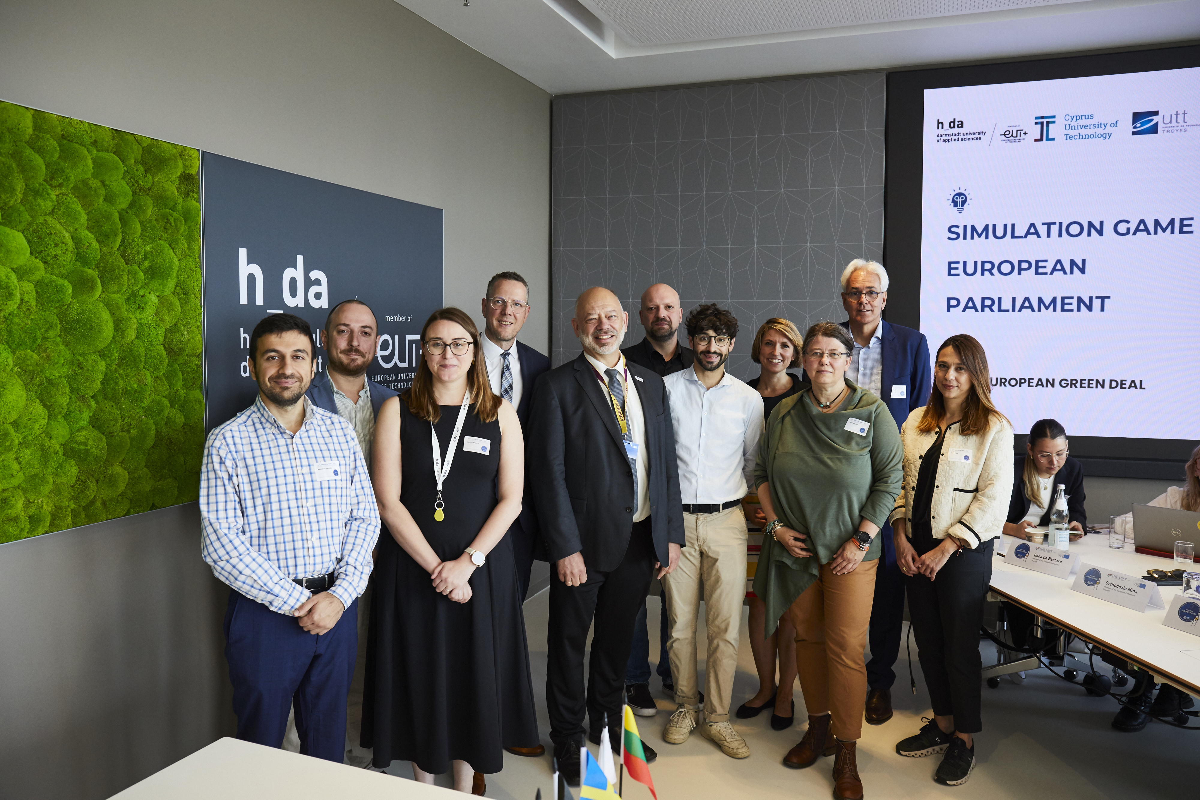 Europe has come to a crossroads and is currently experiencing the biggest crisis since the end of World War 2. Anti-democratic parties are gaining popularity, and politically motivated crimes are on the rise. In times like these, teaching people about democracy is particularly important. The “European University of Technology” (EUt+), which convened on the campus of Darmstadt University of Applied Sciences (h_da) from 3 to 6 June for a working meeting, is also staying abreast of this development: on one of the days, almost 40 students from France, Cyprus and Germany debated the European “Green Deal” as MEPs in a simulation game.