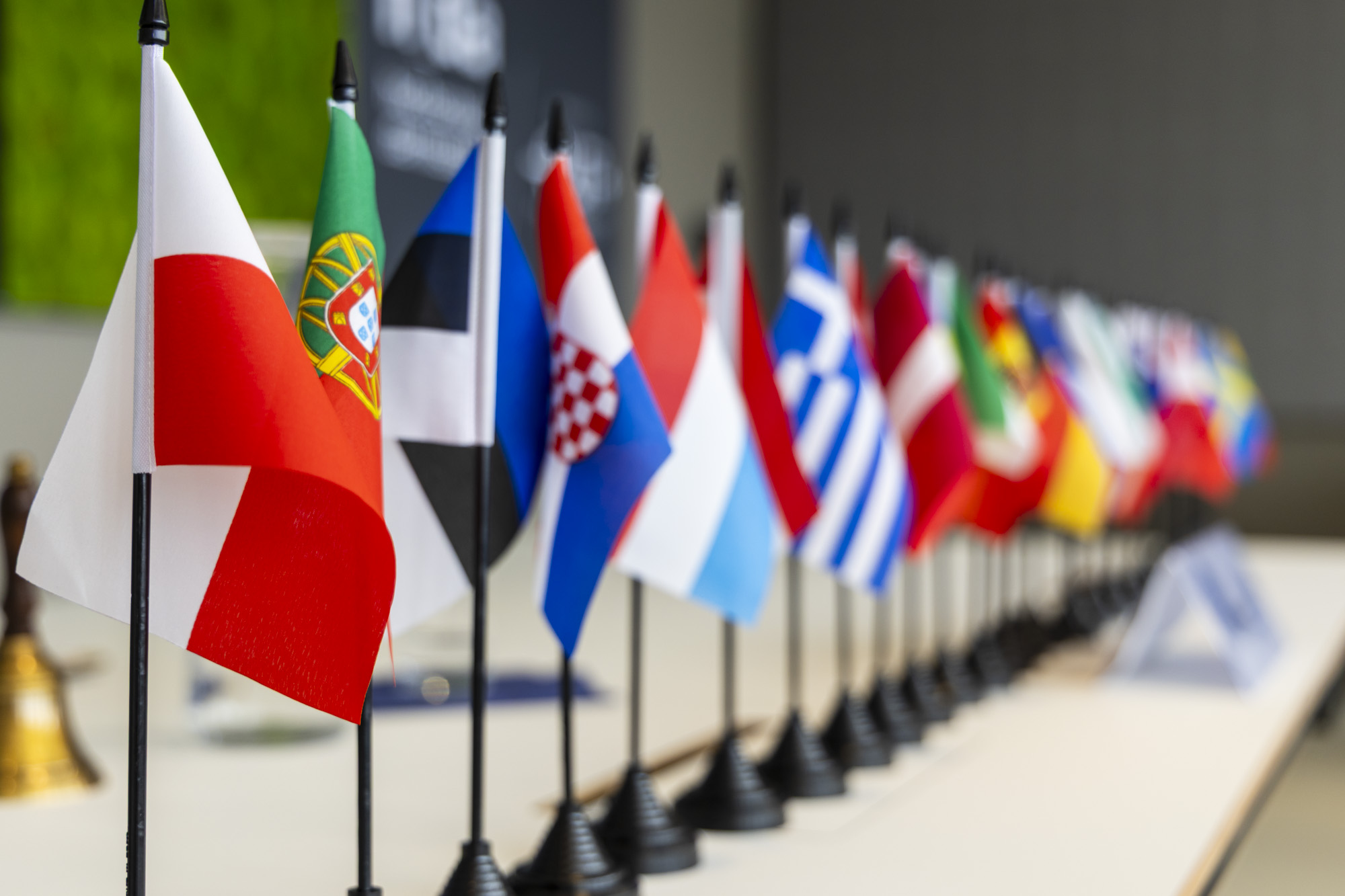 The sky is a mix of white and blue, just like the furniture in the recently refurbished Senate Hall at Darmstadt University of Applied Sciences (h_da), with its impressive view of the Frankfurt skyline. A buzz of different languages can be heard from within on this Thursday morning – and the project “Become a Member of the European Parliament for a Day!” as part of the European University of Technology’s “Darmstadt Week” on h_da’s campus is just as international. “Our Senate Hall is a real eye-catcher, everything is brand new,” says Arnd Steinmetz, President of h_da, in his welcome address to the students from France, Cyprus and Darmstadt, “and it’s at your disposal!” For the “EUt+ Simulation Game”, the room is transformed for a day into the plenary chamber of the European Parliament, with a lectern, a table with the 27 flags of the EU member states, tables for the six political groups, chairs for visitors and large photographs of the European Parliament in Strasbourg on the wall.